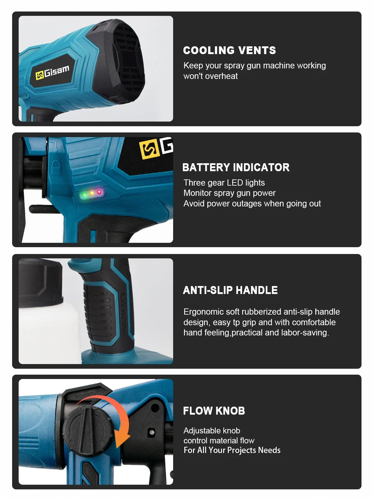 Controle de fluxo ajustável – Regule a saída de tinta ajustando o botão de controle de fluxo no pulverizador para obter diferentes saídas de tinta, adequado para bordas, cantos e amplas superfícies internas de vários projetos de trabalho e DIY