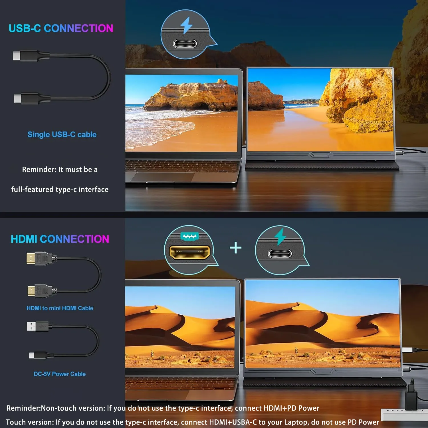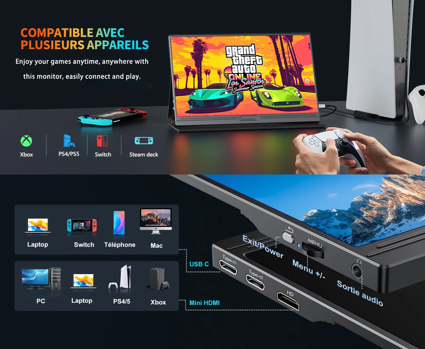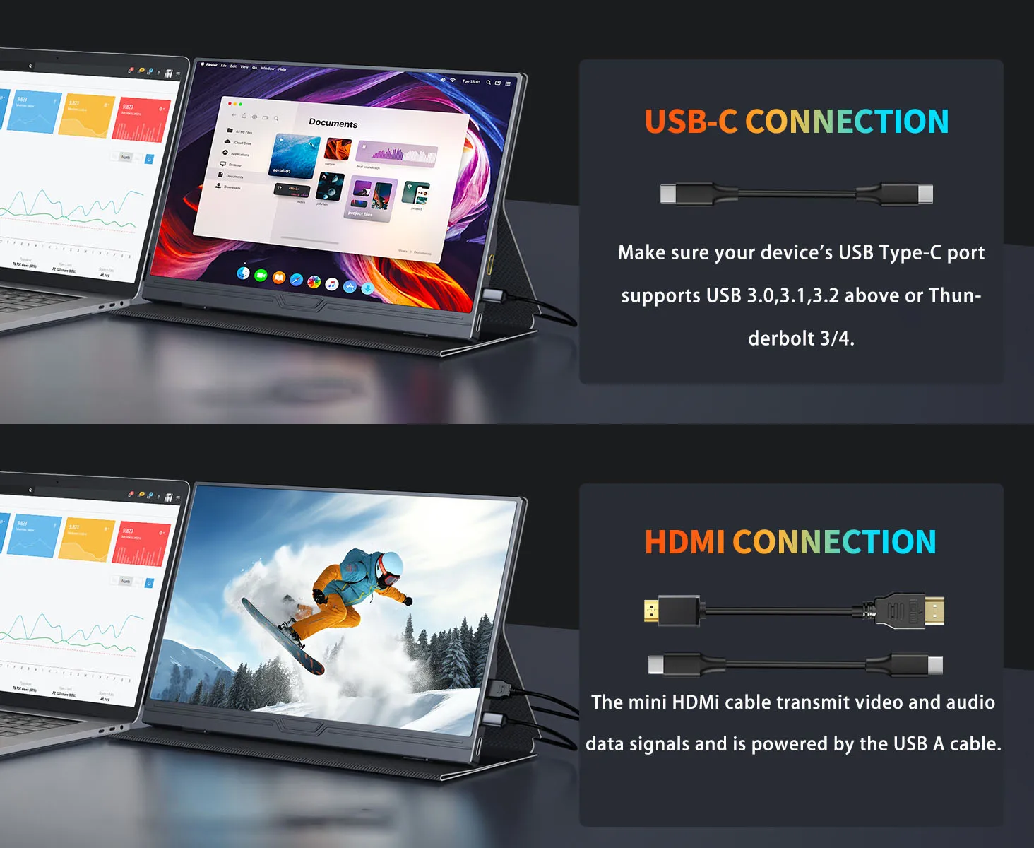 [Monitor plug-and-play] Com duas conexões USB Type-C totalmente funcionais e uma porta Mini HDMI, pode ser usado com laptop, Mac, Mini PC, computador, Xbox, PS5, Switch, Steam Deck, etc.Nenhuma configuração ou download é necessário.Perfeito para os jogadores desfrutarem dos jogos, também para os empresários treinarem outras pessoas ou trabalharem em casa.